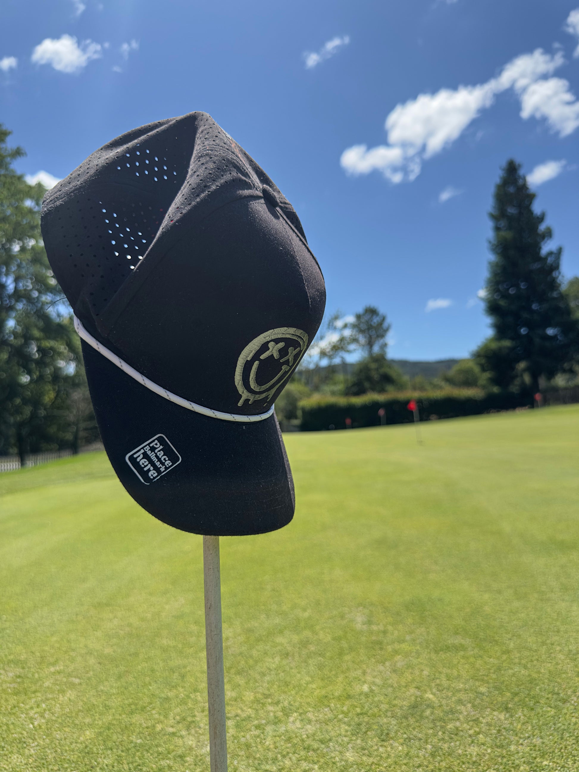 Das schwarze Cap überzeugt mit einer weiß reflektierenden Kordel für einen modernen Look und mehr Sichtbarkeit – perfekt für sonnige Runden oder den späten Abschlag. Auf der Vorderseite prangt das ikonische Smiley-Logo in hochwertiger Stickoptik – ein Symbol für die entspannte, augenzwinkernde Haltung des Happy Bogey Club.